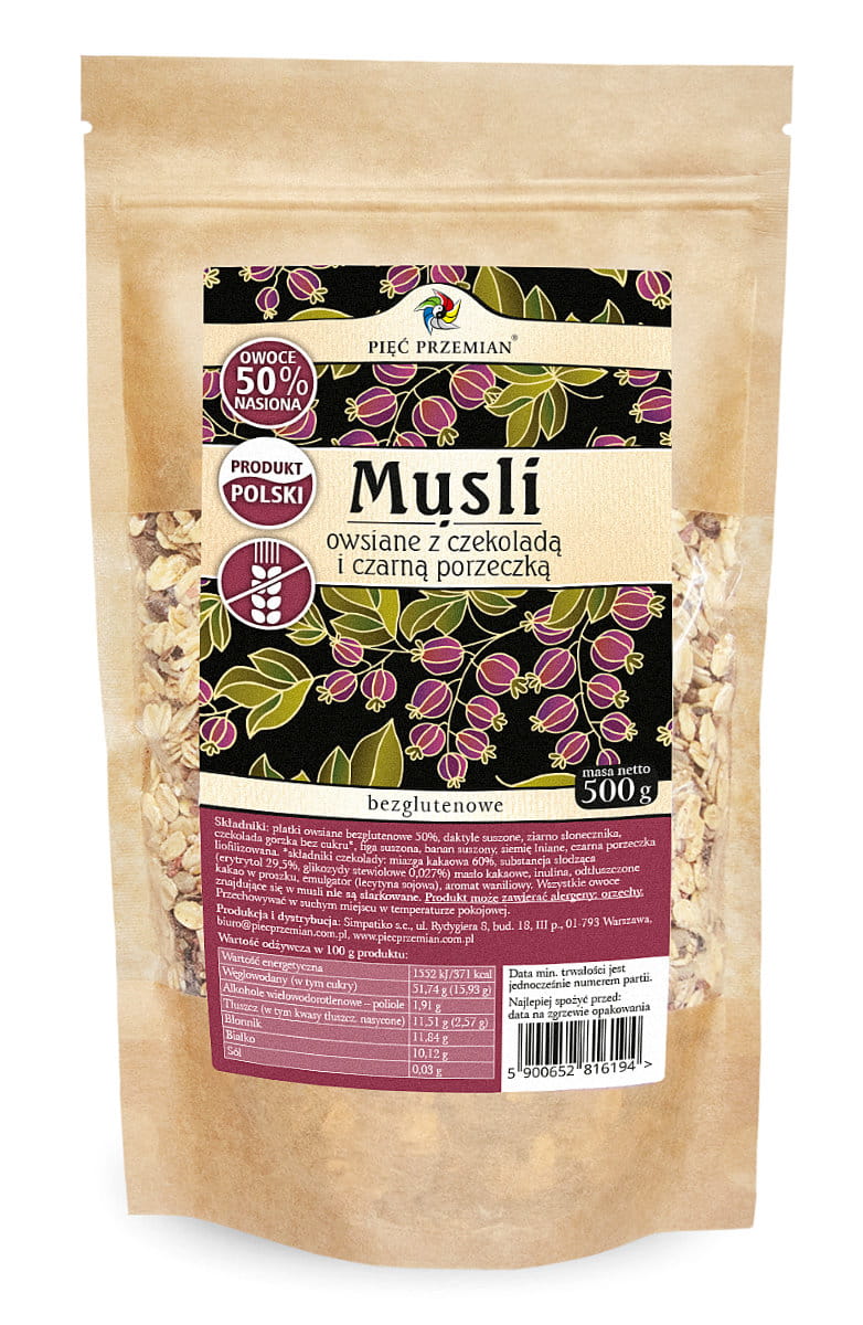 Bezglutenowe musli owsiane z czekoladą i czarną porzeczką 500g Pięć Przemian